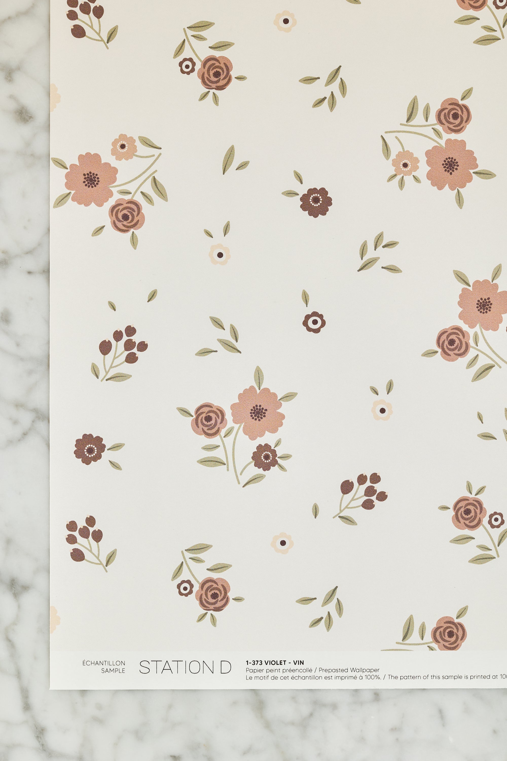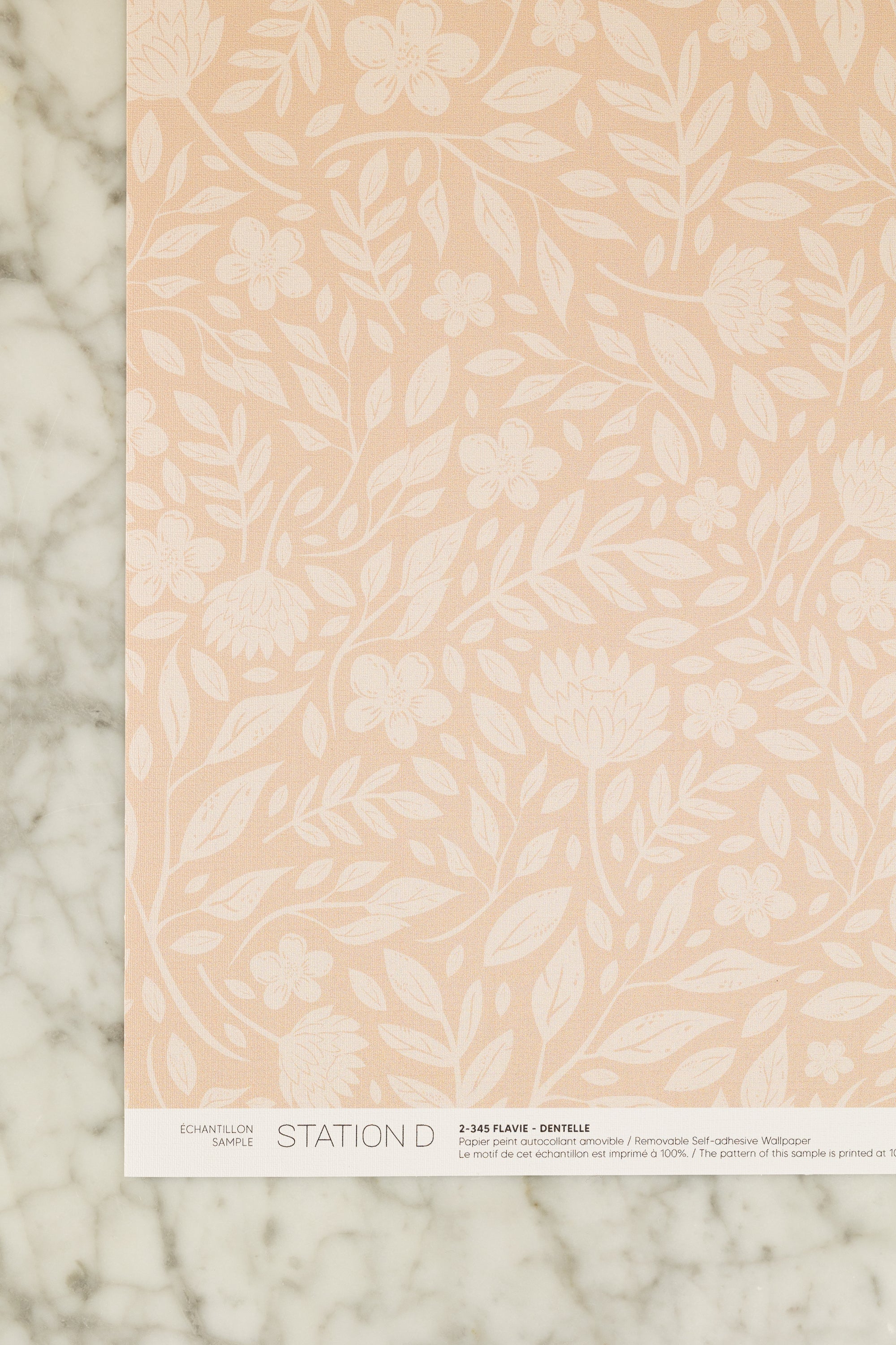 La fibre de notre papier autocollant présente une teinte d'un blanc froid. Comme la couleur de la fibre influence directement le rendu final du papier peint, il est essentiel de commander vos échantillons dans le même type de papier que celui que vous prévoyez utiliser, afin d’obtenir un aperçu fidèle des couleurs.
